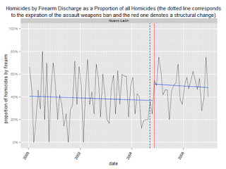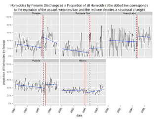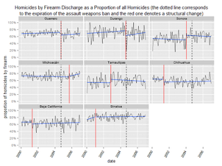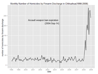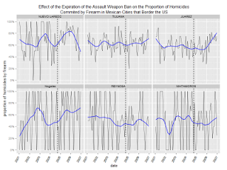 Supposedly after “El Chapo” Guzmán escaped from prison he began to rebuild his drug empire and sometime thereafter entered into a non-aggression pact with the Juárez Cartel, but on Sep 11, 2004, he ended the alliance by killing the brother of the leader of the Juarez Cartel, since neither the proportion or the number of homicides committed with a firearm changed in Ciudad Juárez, my guess is that the breaking of the pact had more to do with the rise in violence than the assault weapon ban.