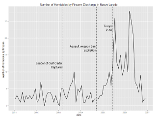 Wow, a big rise in homicides by firearm in Nuevo Laredo that coincided with the expiration. Plus, before the ban the number of monthly homicides was low, which would explain why the variance in the proportion chart was so much greater before the ban.