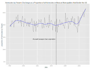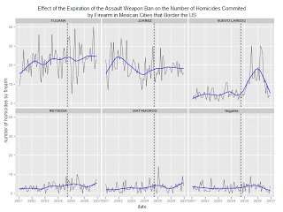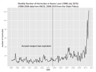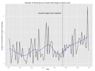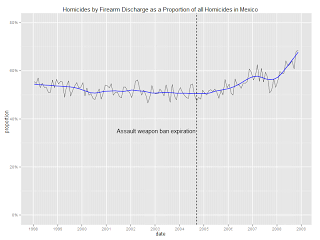 As you can see from the charts there was an increase in the number of homicides and homicides with firearm that coincided with the expiration. The big drop at the start of 2007 was due to the military operations in Michoacan and Acapulco, and also to a temporary drop in the homicide rate of Mexico City (which had nothing to do with the drug war).