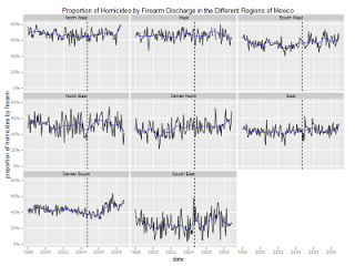 It looks like the proportion of homicides by firearm started changing about a year after the expiration of the assault weapon ban. Mexico is a big country so it’s worth looking at its different regions. There was a coding mistake in the homicide database (Chihuahua was classified as being in the North East), so I divided Mexico into its economic regions: