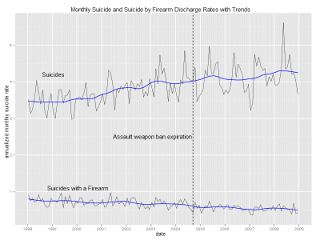 No effect. There’s a very interesting seasonal pattern, and the fact that the suicide rate has been rising while suicide with firearm rate has been decreasing would go against the conventional wisdom that the availability of firearms increases suicides. This, of course, doesn’t concern the effect of expiration of the ban on assault weapons so I’ll leave it at that.
