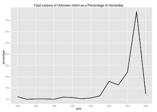 This would tend to corroborate the testimony (Spanish) of “La Barbie” that the leader of the Sinaloa Cartel started sending his people to Ciudad Juárez in 2007, even if the official homicide statistics showed a slight decrease during that year. Interestingly, lesions of unknown intent started rising in 2004, the same year the brother of the leader of the Juárez Cartel was murdered.