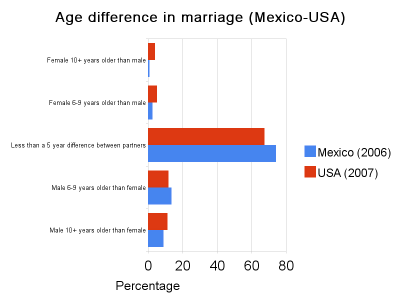 You can get the data for the chart here Although Many Eyes has more chart types (most of which output chart junk) its charts lack the visual appeal of Google Charts, plus Many Eyes is built with Java which means it’s slow and tends to crash my browser while Google Charts uses AJAX. I’ll stick with Google Charts for the time being. P.S. I was surprised by the fact that in the US there is a higher percentage of marriages where the male is 10+ years older than the female, it’s probably due to the fact that divorce is more common in the US.