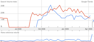 Searches for “influenza” (blue) and “gripa” (red) in the Distrito Federal (Mexico City). The uptick since March 22 in influenza searches was not statistically significant. Funny how the news volume went way up in last days of April ;)
