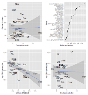 As you can see there is only a slight positive correlation between the corruption index of the Mexican chapter of Transparency International and the percentage of students who cheated on the Grade 6 ENLACE test*. What I find surprising is that there is a negative correlation between GDP per capita and the percentage of cheaters in ENLACE, but only a slightly negative correlation to the corruption index of Transparency International (except perhaps for the DF). Since test scores increase with income, my best guess is that students who don’t understand the test just start cheating.