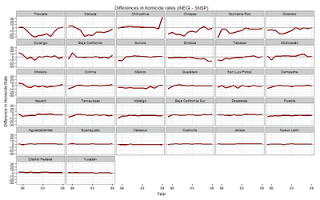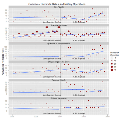 Looking at charts is certainly a fun and very intuitive way of trying to get an idea of the effect of military operations, but there are also statistical tests to date structural changes, and R being open source I used the strucchange package to date the breakpoints in regression models of homicide rates. You can consult a pdf document containing the tables of results for the different states from my github account. They tend to reflect what is aparent from the charts.