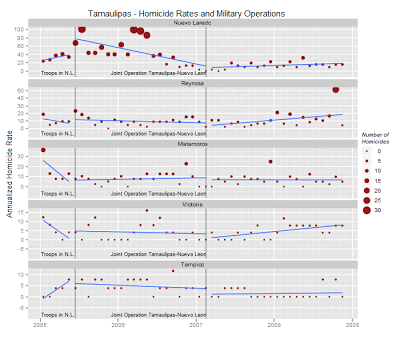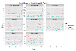 - Notice also the rise and fall of homicide rates in Tamaulipas when the Sinaloa Cartel tried to take over Nuevo Laredo around 2005-2006.