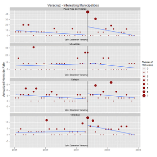 Again we see that sending in the army had the effect of reducing the homicide rate. But after one of the Beltran Leyva brothers, Alfredo Beltran Leyva “El Mochomo” was captured, the homicide rate went up again, especially in the municipalities bordering Michoacan. I’m guessing he was captured around the time La Familia decided to form an alliance with the Sinaloa Cartel.
