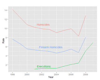- Based on execution rates I predict the homicide rate for 2009 will be 15.5 (95% CI 14.8-16.1) and 19.5 (95% CI 18.4-20.7) for 2010.