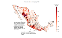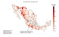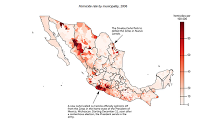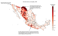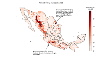 To display the murder rate at the municipality level I’ve switched to choropleths. Keep in mind that the big municipalities tend to draw more attention because of their size, but they also tend to have low population densities. For example, Tijuana, which is an important drug corridor and home to the Tijuana Cartel is barely visible.