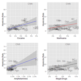 Drug use has increased a lot in Mexico. According to the National Survey of Addictions (“Encuesta Nacional de Adicciones 2008”), the percentage of the population who had consumed cocaine doubled from 1.2% in 2002 to 2.4% in 2008. The percentage of people who consumed cocaine in Mexico during the last year was .4%, what’s more, in Mexico one fourth of cocaine is consumed as crack compared to 14% in the US.Since drug addicts are more likely to be gang members and serve as cannon fodder for the drug cartels, I thought of running some regressions comparing the homicide rate in 2008 with the percentage of the population that consumes different drugs. The results show a significant the relationship between cocaine and amphetamine consumption and homicide rates, the regression for marijuana was not significant, and the regression for consumption of all illegal drugs was barely insignificant (p = 0.7). Still, there were some big outliers in the states where violence has increased the most.