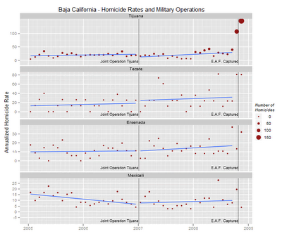Given there wasn’t a spike in the murder rates there was hardly any reason to send in the army in 2007. If you look closely there was an increase in the homicide rate in Tijuana during 2008, but the scary stuff didn’t start until the end of the year.