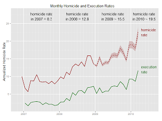 And there are always problems with quoting numbers a few years old when the homicide rate is changing rapidly. Obviously, the Mexican government prefers not to hand out the 2009 numbers (they’re not available anywhere as far as I know), but since the execution rate is reported by two major newspapers and it correlates pretty well with the homicide rate, it is pretty easy to run a regression to predict the current and future rates: