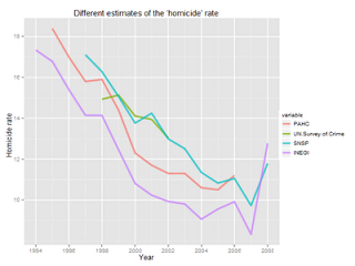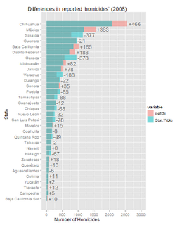 Well, first of all, the police records and the vital statistics records are collected using different methodologies: vital statistics from the INEGI are collected from death certificates and the police records from the SNSP are the number of police reports (“averiguaciones previas”) for the crime of murder—not the number of victims. For example, if there happened to occur a particular heinous crime in which 15 teens were massacred, but only one police report were filed, all the murders would be recorded in the database as one. But even taking this into account, the difference is too high.