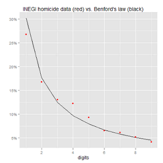 - In Mexico there are two sources of homicide data: Police records (provided by the SNSP), and the vital statistics system (provided by the INEGI). Not surprisingly both series fail to follow Benford’s law. A closer look a the data reveals that: