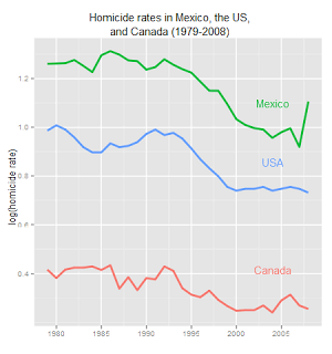 I’m surprised by how similar the trends are (excluding the drug war in Mexico). There were big decreases in the homicide rate in all three countries starting in the early nineties, which then slowed down around 2000.