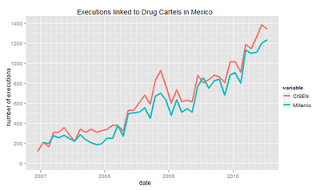 We can also compare the CISEN data to the number of executions as reported by the Mexican newspaper Milenio. From January 2007 to July 2010 Milenio reported about 3,900 less executions than the CISEN. Even so, the trendlines are pretty close:
