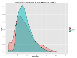 The distributions of the ages of homicide victims grouped by sex: