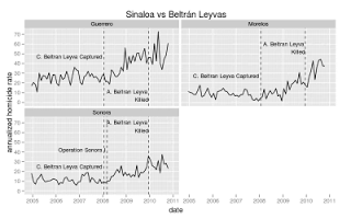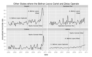 In April the leader of the Beltrán Leyva’s in Nayarit kidnapped and killed the son of the Sinaloan boss in Jalisco, Nacho Coronel, afterwards violence rose steeply. When Nacho Coronel was killed by the army in July violence decreased somewhat in Nayarit but rose in Colima.
