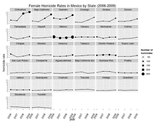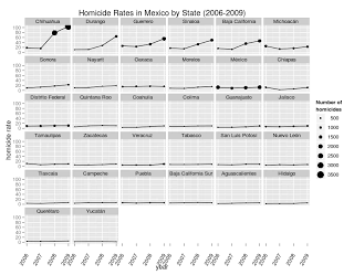 Interestingly, the rate for Michoacán in spite of the drug war is nowhere near its maximum. The rate for 11 states is above or near their maximum from 1990 to 2006 and for 7 it is at or near their lowest rate (hint hint future presidential candidate).