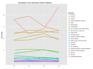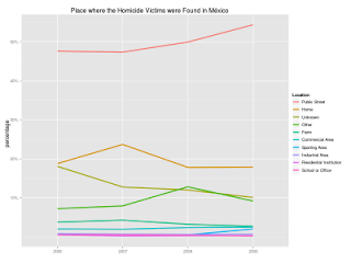 There was a big increse in the proportion of victims whose ocupation was unknown (maybe it’s time to include “sicario” in the list of occupations):The proportion of homicides that occurred out in the streets keeps on increasing: