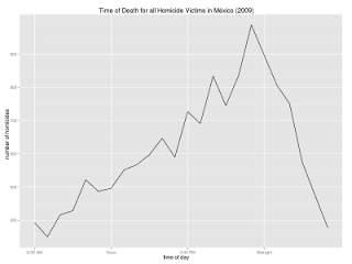 (There was a mistake in the database, when the hour of death was unknow it was coded as having occurred at midnight, I discarded that value and used the average of the number of homicides between 11:00pm and 1:00am)