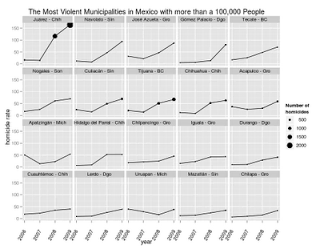 Ciudad Juárez was again the most violent municipality with a total of 2316 (about 2375 taking into account that there wasn’t enough time to record all homicides that occurred in 2009 into the database) which is much lower than the press reports of about 2700.