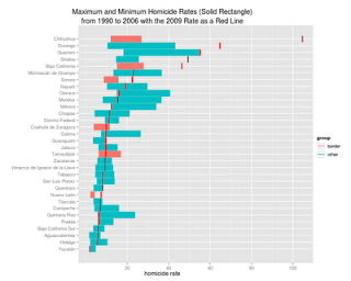 In this chart I show the maximum and minimum homicide rates from 1990 to 2006 (right before the drug war started) and compare it with the 2009 rate to put it in historical perspective: