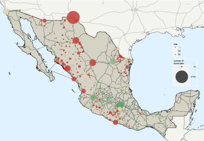 It turns out it is really easy to customize maps with Fusion Tables and the Maps API so I recreated the above map of the number and rate of drug-related homicides by municipality or metropolitan area.