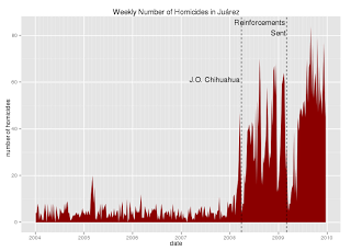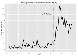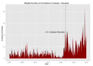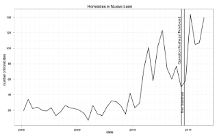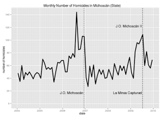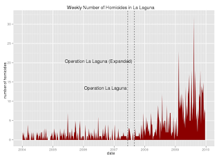 Looking at the drug-related homicide rates we see a similar pattern. Noé Sandoval, the general in charge of Joint Operation Culiacán-Navolato, was promoted in December 2010 to be commander of the IV Military Region headquartered in Monterrey, Nuevo León.