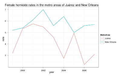 Ciudad Juárez is a clear outlier in female homicides, a female homicide rate of 58 is unbelievably sad. Since Juárez had a reputation for being a killing ground for women since before the drug war, I again did a comparison with the metro area of New Orleans (parishes of Jefferson, Orleans, Plaquemines, St. Bernard, St. Tammany, St. Charles, and St. John the Baptist) using data from the CDC, and while you can argue just how accurate the population estimates for both cities are and whether all homicides were recorded properly in Juárez, I don’t think it’ crazy to claim that before the drug war Juárez was safer for women than New Orleans.