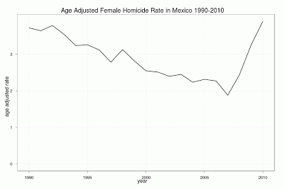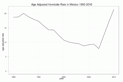 Since the median age in México went from 19 in 1990 to 26 in 2010 I figured I’d age adjust the data using the 2000 Mexican population estimates from the CONAPO/COLMEX
