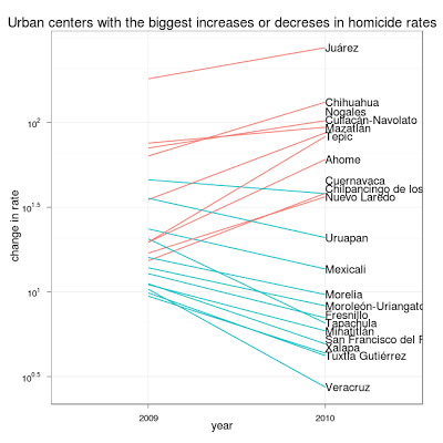 The urban centers that saw the biggest increases or decreases in homicide rates with a log scale: