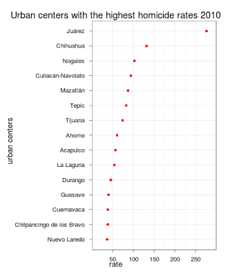In Ciudad Juárez there were a total of 3,800 homicides (3,684 in the database), but there were 193 deaths of unknown injury intent, there are only 400-500 deaths by accidents each year in Juárez and 2010 wasn’t anything out of the ordinary, so many of those deaths of unknown intent are likely to be homicides. Coming up with an exact number is complicated. Whichever the true number, the metro area of Ciudad Juárez with a population of 1.3 million had more deaths than the states of California and Texas combined.What’s weird about the 2010 homicide number in Juárez is that at first the Fiscalía del Estado put the number of homicides at around 3,000, but much later in 2011 corrected the number to 3,600. This is something to keep in mind with all the talk of Juarez becoming less violent in 2011. Numbers can be updated, and I wonder if the whenever the drug-war related homicide database is updated it will reflected the newer homicide data.