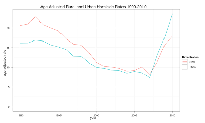 Note the rapid rise in the homicide rate of 15-19 year olds.P.S. You can download the code to clean up the homicide data from github or simply check out the cleaned up files from the data sets section of my website