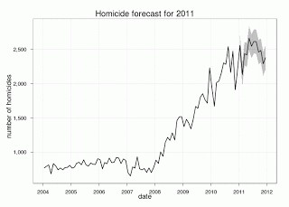 Since the Mexican police has been publishing monthly homicide statistics for 2011 I decided to use the auto.arima function from the forecast package to predict homicides and drug war-related homicides in 2011. It may sound silly to use police homicides to predict vital statistics homicides, but the Mexican police is notorious for under-reporting homicides and manipulating the data they publish, even if it does follow the overall trend in violence. The results were between 13,000 and 19,100 drug war homicides and between 27,500 and 31,700 homicides in 2011