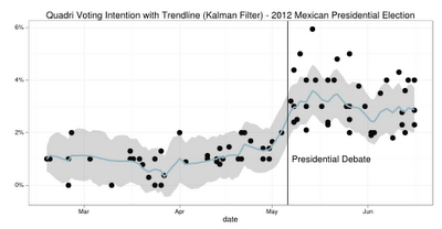 Gabriel Quadri, the candidate for the Mexican presidency of a small party practically owned by the teachers’ union must be a good debater. Since his debate performance he has managed to consistently poll over the 2% required for his party to keep its registration. One small problem with this analysis is that sometimes polling firms report voter preferences as rounded numbers, and for candidates polling in the 0-4% range this introduces some artifacts.