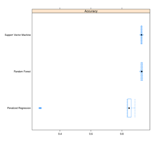 I divided the dataset into training (75% of the data) and test sets. I then fit a penalized a regression (glmnet package), a support vector machine (with a radial kernel since it had better performance than a linear one), and a random forest model to the training set and evaluated their accuracy against the test set using the caret package.