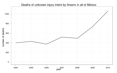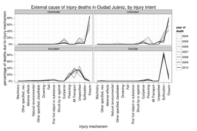 The Mexican government supposedly keeps a record of all deaths in its mortality database. For my purposes there are four types of violent or injury intent deaths:
