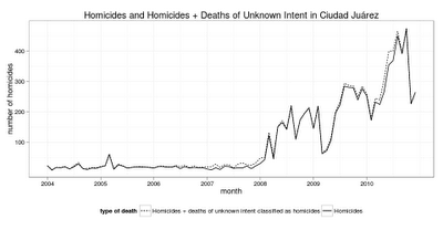 - Given that classifying deaths of unknown intent increased the number of homicides by about 50% in 2007— before the violence started— statistical manipulation is certainly worth some consideration. According to wikileaks Juárez had 316 murders in 2007 (though it’s not clear if the number refers to the Zona Norte) which is close to the imputed estimate.
