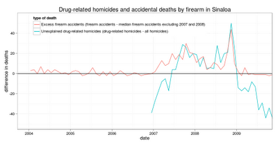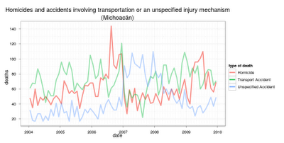 In Michoacán homicides dropped soon after the start of the Operation Michoacán on December 11, 2007, but accidents of unknown injury mechanism rose at the same time, since transport accidents dropped at the same time as homicides it is not entirely clear what happened: