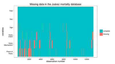 Of course things are never as simple as in textbooks, and the Mexican mortality database has some missing values. I assumed homicides where the year of occurrence was not available occurred in the same year the death was registered. For the rest of the data I used k-Nearest Neighbors to impute the missing values.