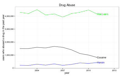 The spike in heroin users in 2006 is probably because the NSDUH is a household survey and as such it probably has quite a bit of error in capturing the real number of drug users. Since most drug consumption is due to addicts, I’m also showing data for those persons that were dependent or abused drugs.
