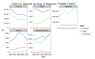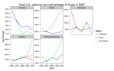For drug seizures I used data from the National Drug Threat Assessment 2011 (page 50). The southwest region corresponds to the the US-Mexico border crossings and nearby counties. Basically seizures of all drugs along the US-Mexico border have gone up except for cocaine, probably because cocaine consumption has decreased. (Also see this blog post by Alejandro Hope for Mexican drug seizure data)