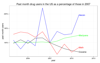 According to data from the National Survey on Drug Use & Health 2001-2011 marijuana and heroin use are up, but cocaine and methampethamine use are down. (Data on methamphetamine consumption was statistically adjusted to account for survey changes)