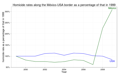 Keep in mind that violence in Mexican municipalities at least 160km from the border was lower in 2006, when the drug war started, than in 1999.
