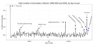 I find it quite interesting that the day of the dead would be one of the most violent days of the year. In countries where most homicides are solved, most homicide victims knew their attacker, so perhaps hanging out with family and friends during the holidays is not such a good idea? Does that stress people out?