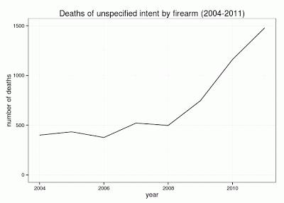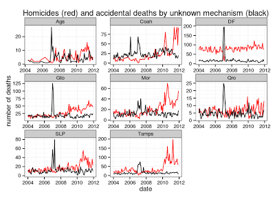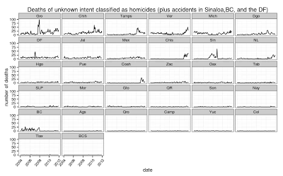 Violent deaths can be classified as suicides, accidents, homicides, legal interventions and those of unspecified intent. There has been an upsurge in deaths of unspecified intent by firearm in Mexico at the same time all homicides increased, so it’s natural to assume that some of those unspecified deaths were really homicides.