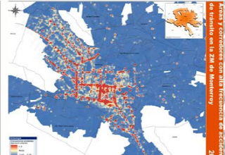 In this presentation by Arturo Cervantes you can see that the areas with the most homicides kind of match the locations of motor vehicle accidents. The central part of Monterrey is actually less population dense than other areas, but apparently everybody travels there for work or play. And since everybody is there, that’s where most homicides happen.