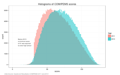 For some reason the 2013 scores went up compared to 2011. Even when taking into account that nowadays high school is mandatory and everyone is guaranteed a place no matter how low their scores. With a guaranteed spot I can see how the big discontinuity at score 31 would disappear in 2013 with some students slacking off since they are now guaranteed a place, but there was also an increase in the right side of the curve, so students this year were overall smarter (an improvement of 7 points is a lot).